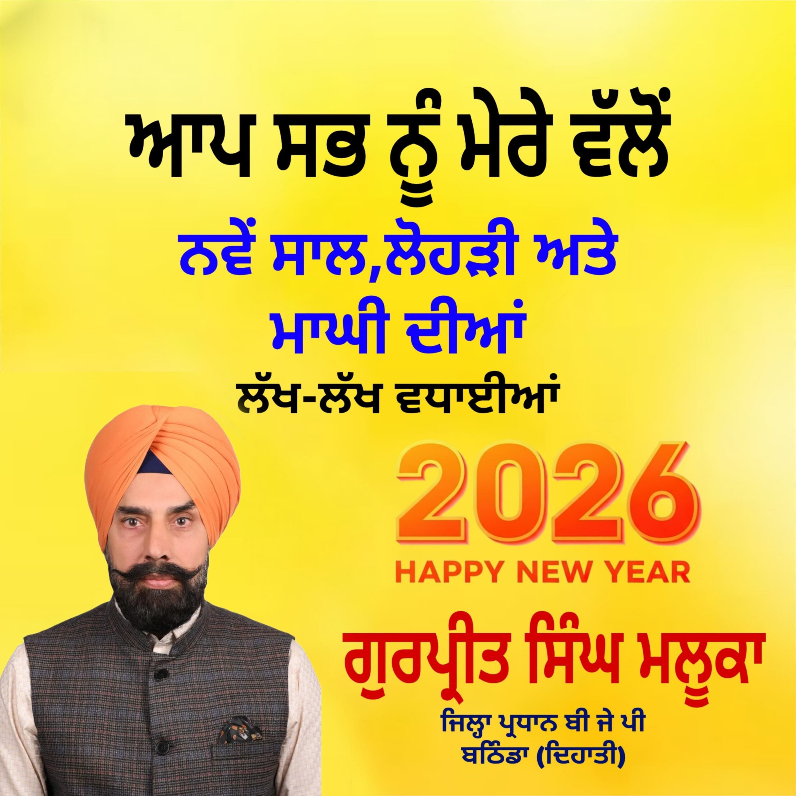 ਨਵੇਂ ਸਾਲ ਦੀਆਂ ਬਹੁਤ ਬਹੁਤ ਮੁਬਾਰਕਾਂ ਜੀ- ਗੁਰਪ੍ਰੀਤ ਸਿੰਘ ਮਲੂਕਾ, ਜਿਲ੍ਹਾ ਪ੍ਰਧਾਨ, ਭਾਜਪਾ (ਦਿਹਾਤੀ)