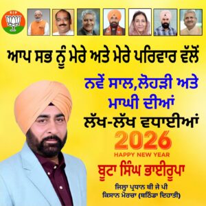 ਨਵੇਂ ਸਾਲ ਦੀਆਂ ਬਹੁਤ ਬਹੁਤ ਮੁਬਾਰਕਾਂ ਜੀ – ਬੂਟਾ ਸਿੰਘ ਭਾਈਰੂਪਾ, ਪ੍ਰਧਾਨ ਕਿਸਾਨ ਮੋਰਚਾ ਬਠਿੰਡਾ
